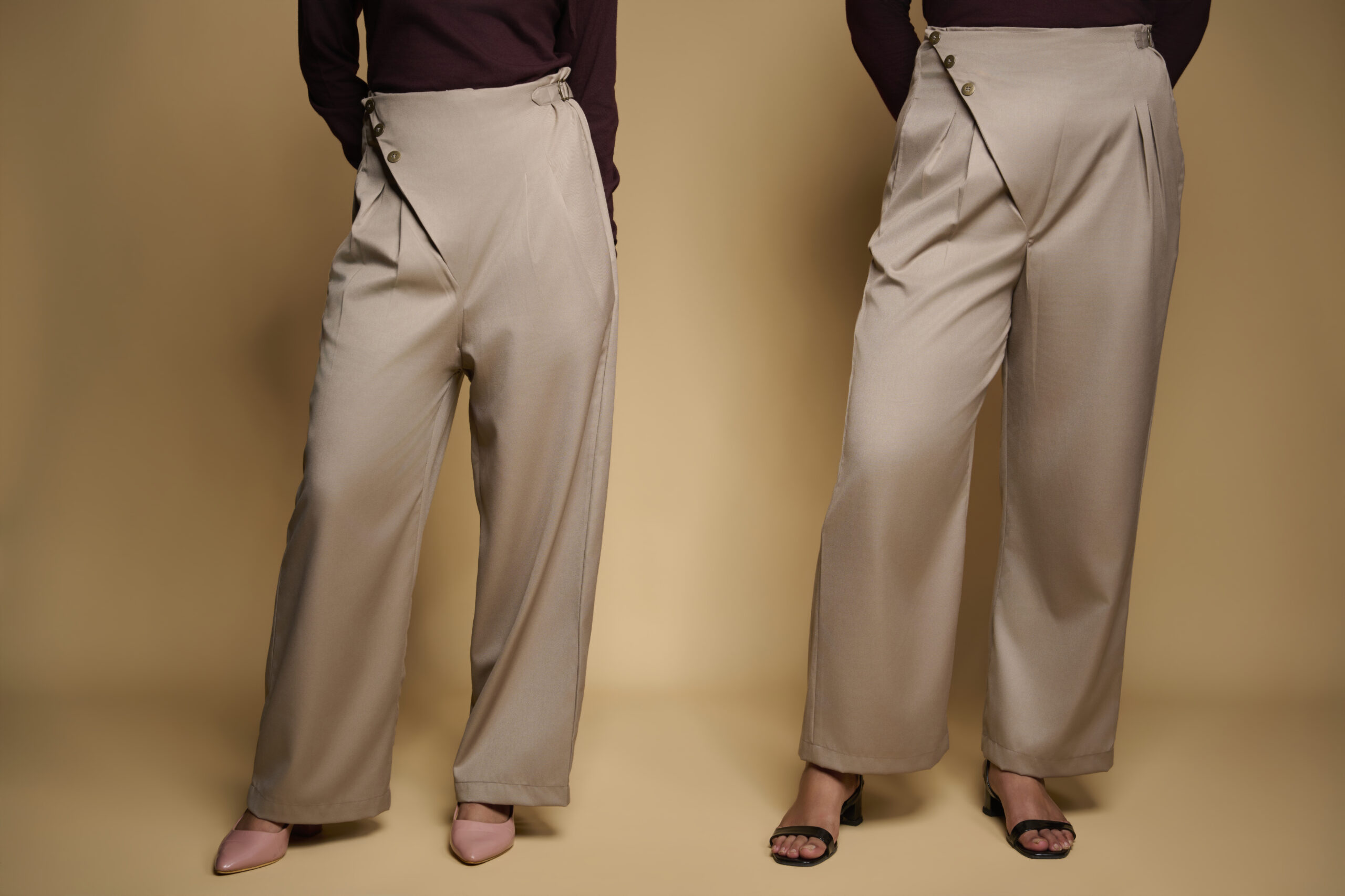 A refined take on everyday tailoring, these light mocha pants are designed to bring together structure, comfort, and understated elegance. The distinctive side flap with three metal buttons adds a unique, elevated detail, while the adjustable side buckle allows you to tailor the fit perfectly to your waist. Crafted in a smooth, breathable fabric, the silhouette falls effortlessly with a clean, wrinkle-resistant finish that keeps you looking polished throughout the day. Thoughtfully designed with deep functional pockets, this pair transitions seamlessly from office hours to evening plans, making it a versatile essential in a modern wardrobe.